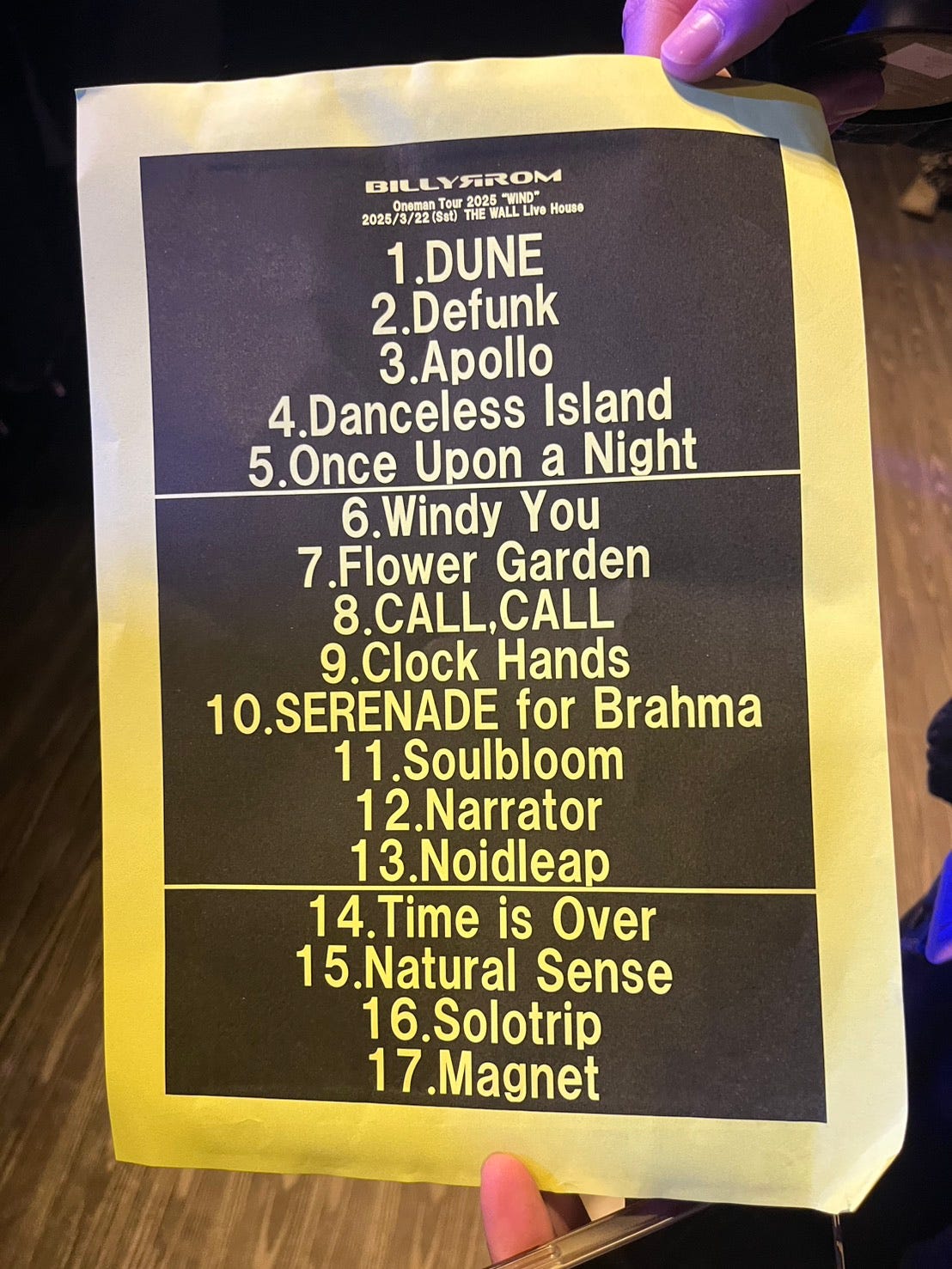 因為Billyrrom作品不算多,搭車和等待入場的時間夠我好好地複習歌單,或許是獨自去看表演沒得和人討論,心情依然平靜,迷妹能量不足,觀察一下周邊的樂迷發現部分人是因為去年在赤聲躁動音樂祭看了他們的表演而買專場,顯得抱著「考究年輕日團專場實力」角度的我有點老成跟專業,直到燈光暗了下來、團員一個個地在歡呼聲下出場、主唱 Mol 開口唱出第一顆音符後,突然有了變化。